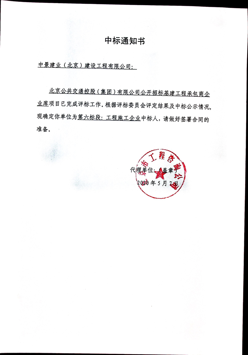 恭喜我公司成為北京公共交通控股(集團)有限公司第六標段:工程施工企業的中標人